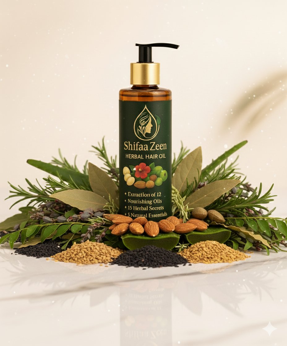 ShifaaZeen Herbal Hair Oil is a premium, multi-action formula designed to restore, strengthen, and deeply nourish your hair using the purest elements of nature. Enriched with 12 Nourishing Oils, 15 Herbal Secrets, and 5 Natural Essentials, it supports faster hair growth, reduces hair fall, and enhances shine — without a drop of chemicals.